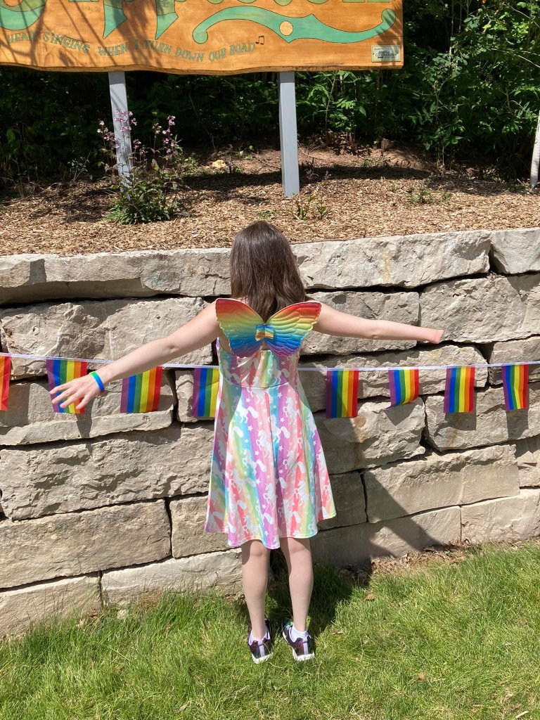 Last weekend I was at my local Pridefest, and the organizers were going around asking people to participate in a fashion show. They asked me, and even though I was hesitant, I did it. I was nervous when it was about to be my turn to walk the stage, but I went for it. I felt so free and proud of myself strutting my stuff and twirling in my rainbow wings.